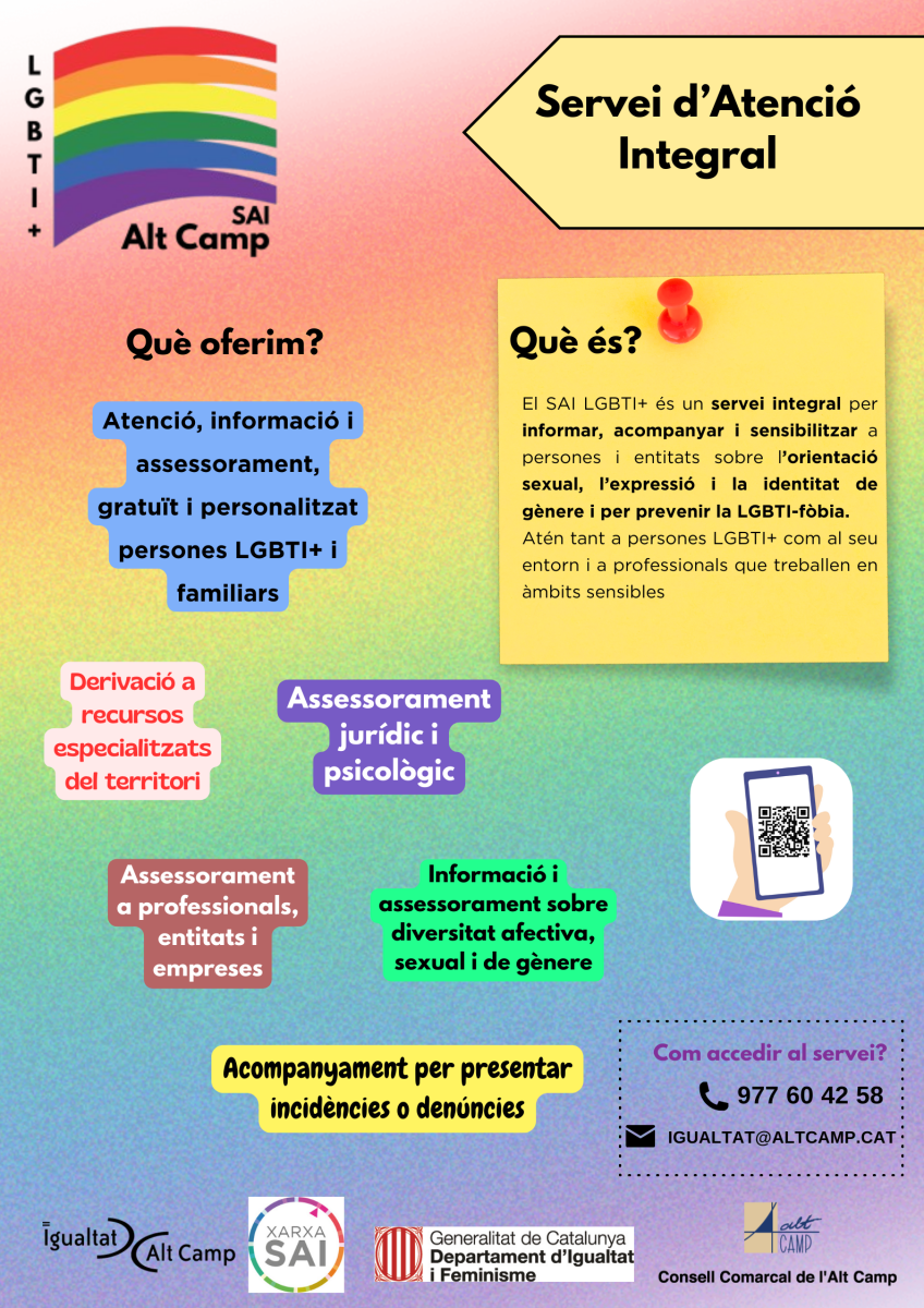 El SAI LGBTI+ és un servei integral per informar, acompanyar i sensibilitzar a persones i entitats sobre l'orientació sexual, l'expressió i la identitat de gènere i per prevenir la LGBTI-fòbia. El servei és gratuït i confidencial. Amb escolta activa i de confiança i de respecte; per a persones LGBTI+, familiars i entitats. Ubicat a les dependències del Consell Comarcal de l'Alt Camp i va destinat a tots els municipis de la comarca (excepte Valls que disposa de servei propi).